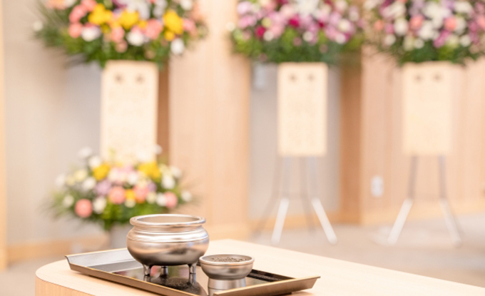 葬儀で使用される生花で装飾された祭壇。故人の人柄や家族の意向に応じてデザインされる。